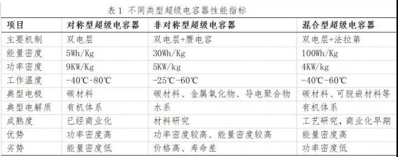 按照儲能機(jī)理不同,可以將超級電容器分為對稱性超級電容器、非對稱性超級電容器和混合型超級電容器,三類超級電容器性能見表1。