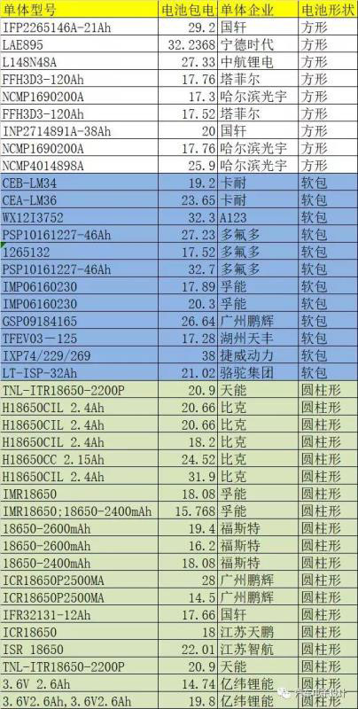 1)2019年上半年主要的電芯規(guī)格