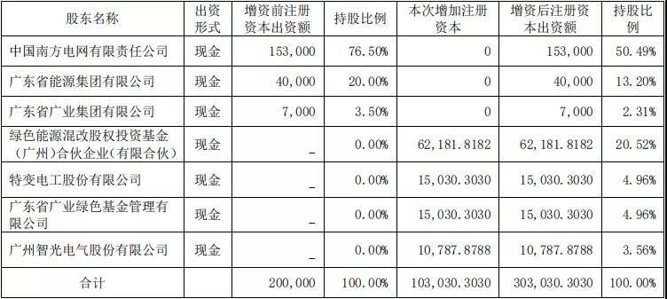 南網(wǎng)能源公司為南方電網(wǎng)國(guó)有控股公司,成立于2010年,公司法人及董事長(zhǎng)為秦華。本輪增資擴(kuò)股之后,注冊(cè)資本金將由2億元提高到3.03億元。南方電網(wǎng)持股比例也由此前的76.5%,降至50.49%。