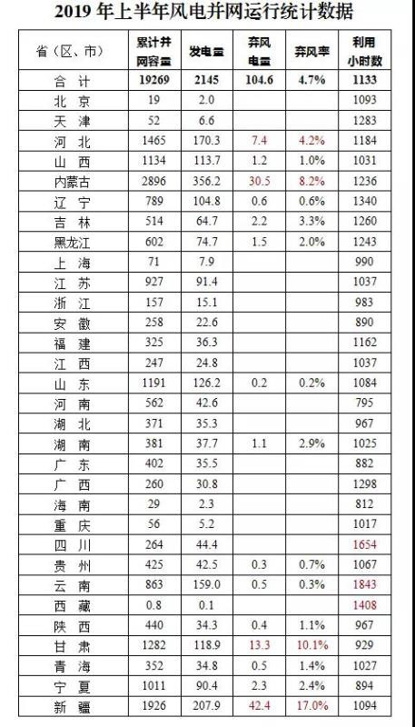 2019年1-6月,棄風(fēng)仍較為嚴(yán)重的地區(qū)是新疆(棄風(fēng)率17.0%、棄風(fēng)電量42.4億千瓦時)、甘肅(棄風(fēng)率10.1%、棄風(fēng)電量13.3億千瓦時)、內(nèi)蒙古(棄風(fēng)率8.2%、棄風(fēng)電量30.5億千瓦時)。