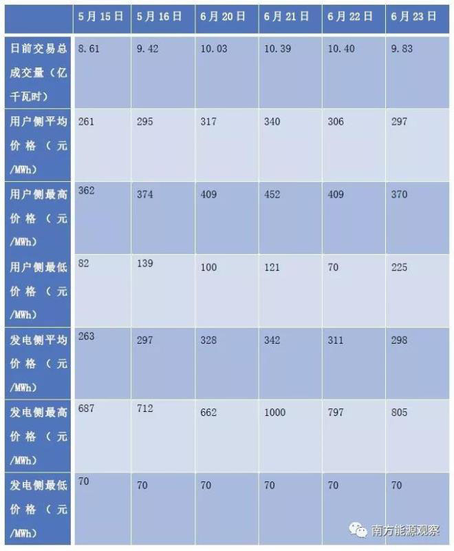 2019年5月、6月,南方(以廣東起步)作為首批電力現(xiàn)貨試點(diǎn)之一,選取6天進(jìn)行了結(jié)算試運(yùn)行。廣東電力交易中心公布的日前交易結(jié)果如下: