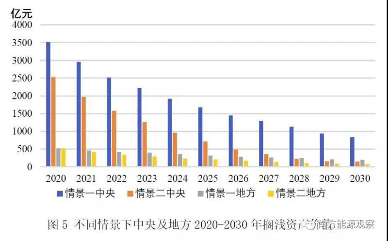 情景二:采取積極的煤電供給側改革措施,合理控制煤電裝機數(shù)量,到2030年,煤電裝機規(guī)模保持在一個較低水平。2020-2030年間,除去正常退役和續(xù)建“十三五”期間停緩建的煤電機組外,延遲退役5000萬千瓦煤電小機組。通過提高環(huán)保排放標準提前關停部分落后煤電機組,根據(jù)不同機組的服役年限、機組容量以及當?shù)匦枨螅ㄟ^靈活性改造使部分成為保障新能源服務的有價值的機組,其余機組進行戰(zhàn)略封存。此時,到2030年,煤電機組為11億千瓦。以2020年為擱淺年份,擠出機組提前退役擱淺價值4009億元(較情景一低32億元),而隨著擱淺年份的推移,擠出機組提前退役擱淺價值逐漸減小。在這一情景下,2030年總擱淺價值為400億元,遠低于情景一。
