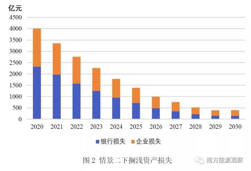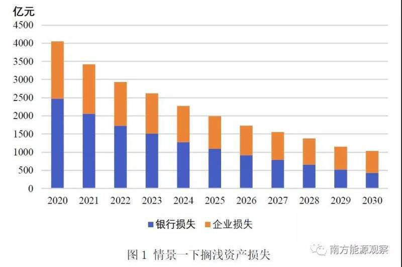 第二,新建機組造成老機組的擠出,老機組面臨較高的擱淺風險。若以2020年為擱淺年份,當年新建成的機組擠壓老機組的市場空間,使其提前退出市場,老機組剩余壽命期內(nèi)資產(chǎn)價值即為擱淺價值,包含了擠出銀行擱淺價值和擠出企業(yè)擱淺價值,共計4041億元。以2020-2030各年為擱淺年份,由于擠出機組大部分為運行多年的機組,而服役滿30年的機組擱淺價值清零,擠出機組的擱淺價值不斷減少。但2030年當年的擱淺價值仍將達1032億元。
