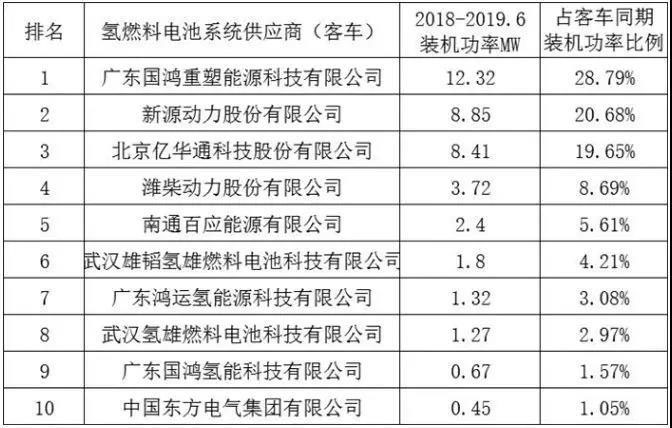 在客車方面,2018年-2019年上半年已投產(chǎn)的客車裝機(jī)功率為42.80MW,國鴻重塑、新源動(dòng)力、北京億華通名列前3,裝機(jī)比例分別為28.79%、20.68%、19.65%,CR3達(dá)到了69.15%