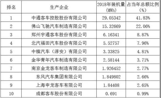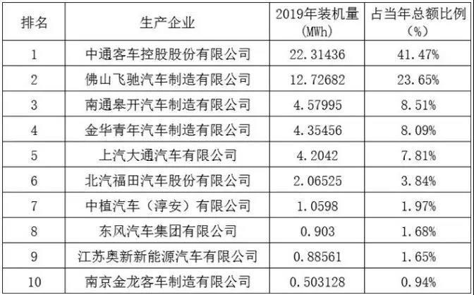 在2019年上半年,中通客車與佛山飛馳保持領(lǐng)先,裝機(jī)量合計(jì)達(dá)到上半年裝機(jī)總量的65.12%。在第三名開始榜單發(fā)生巨大變化,進(jìn)入前5的南通皋開、金華青年、上汽大通在去年甚至沒有進(jìn)入前10榜單。