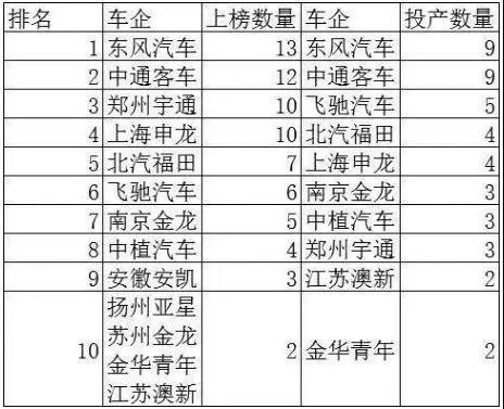 有意思的是,對(duì)比13批共91款《推薦目錄》的上榜車型及企業(yè),投產(chǎn)車型的排名出現(xiàn)了一定的變化。東風(fēng)與宇通在兩份榜單上均名列前2,但在之后則出現(xiàn)了較大的差異,如有10款上榜推薦目錄的宇通與申龍,分別只投產(chǎn)了3款與4款汽車,而只有2款車型上榜目錄的金華青年與江蘇澳新全部投產(chǎn)。