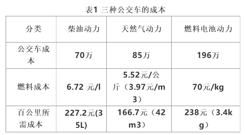 大金龍XMQ6125G的油耗未找到官方數(shù)據(jù),根據(jù)百度知道數(shù)據(jù),11-12米公交車(chē)的油耗約為30-35升,因此選為35L。而由卡車(chē)之家數(shù)據(jù),通常氣耗與油耗比為1.1-1.2之間,即每消耗1L柴油相當(dāng)于消耗1.1-1.2方的天然氣。因此,天然氣客車(chē)采用42立方米進(jìn)行計(jì)算。而根據(jù)成都市燃料電池客車(chē)示范運(yùn)行的數(shù)據(jù),燃料電池客車(chē)平均氫耗為3.4kg/百公里(數(shù)據(jù)來(lái)源:http://m.evpartner.com/news/detail-41996.html)。