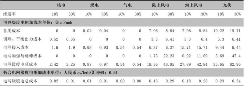 基于當時的技術(shù)水平和裝機容量,OECD/NEA以2012年的德國電力系統(tǒng)為例,對各項技術(shù)在不同滲透率的情況下、電網(wǎng)級別需要額外考慮的成本進行了估計。從分析可知,核、煤、氣等具有良好調(diào)峰性能和規(guī)模效應(yīng)的電源附加成本較低;而風(fēng)電光伏等電源由于間歇性特征對調(diào)峰、備用和電網(wǎng)建設(shè)等的需求較大,在10%滲透率下,需每度電額外考慮0.1-0.2元/kwh的成本,如滲透率為30%,電網(wǎng)側(cè)附加成本還要更高。
