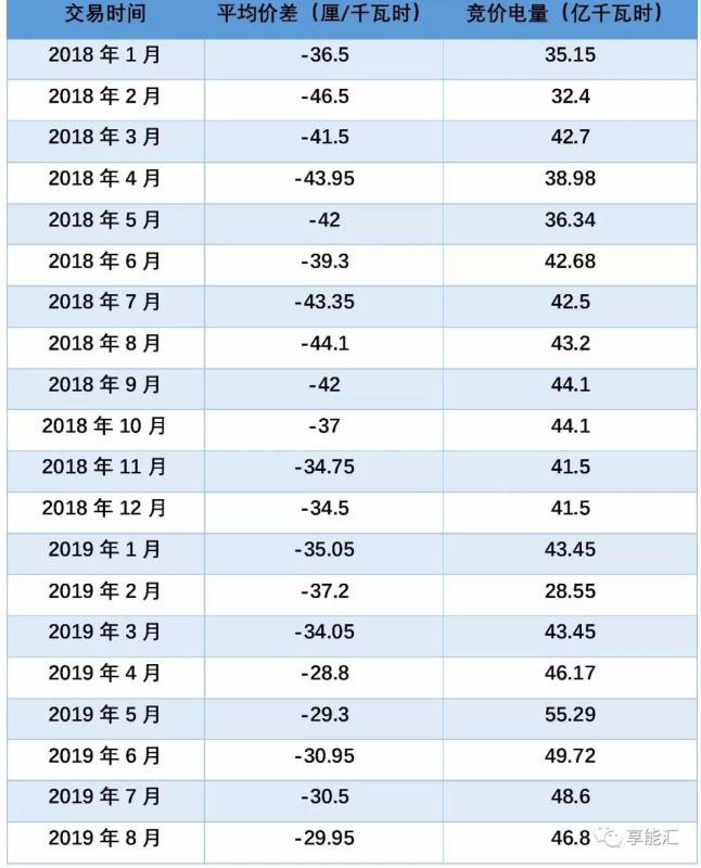 表1:2018年前年到2019年前8個(gè)月廣東集中競爭交易價(jià)差和電量(價(jià)差和電量均為四舍五入后數(shù)據(jù))