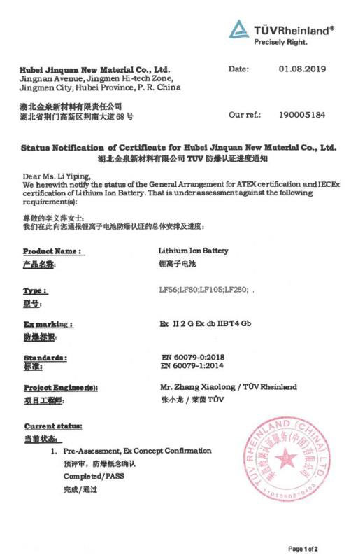 2019年8月1日,金泉能源磷酸鐵鋰電池LF80/105/280完美通過(guò)德國(guó)萊茵TüV ATEX防爆認(rèn)證,標(biāo)志著金泉能源產(chǎn)品技術(shù)水平和產(chǎn)品安全性能達(dá)到了更高的水平!