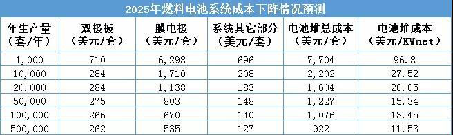 影響其成本的主要組件包括燃料電池堆中的質子交換膜、催化劑中鉑的含量、雙極板材料,以及電池系統中的儲氫罐、升壓變頻器、動力單元等。
