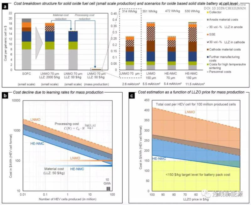 高成本也是目前全固態(tài)鋰離子電池急需解決的問題之一。以常見的石榴石結(jié)構(gòu)的LLZO電解質(zhì)為例,其當前價格高達2000$/kg,遠高于傳統(tǒng)的碳酸酯類電解液。其次,生產(chǎn)過程成本在目前的固態(tài)電池成本中占比達到75%。根據(jù)測算在小批量生產(chǎn)時(10000只/年)其生產(chǎn)過程成本會高達750-2500$/kWh,即便是生產(chǎn)規(guī)模擴大到1億只/年,其生產(chǎn)過程成本仍然高達75-240$/kWh,在電池成本中占比超過50%,遠高于目前的鋰離子電池工藝成本【11】。