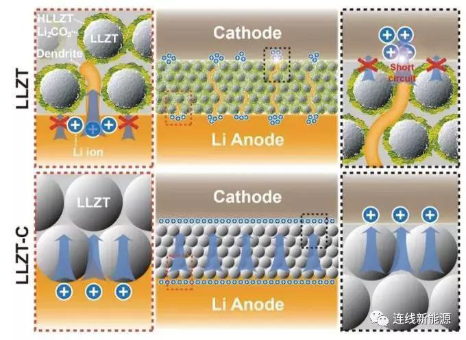 是的你沒有看錯,固態(tài)電池仍然存在鋰枝晶問題,通常我們認為固態(tài)電解質(zhì)良好的機械強度能夠有效的抑制Li枝晶的生長,但是研究卻表明Li枝晶仍然能夠沿著Li7La3Zr2O12(LLZO)和Li2S–P2S5兩類固態(tài)電解質(zhì)的晶界快速生長,往往幾十次循環(huán)就會發(fā)生內(nèi)短路【9】,嚴重影響全固態(tài)鋰離子電池的使用壽命。