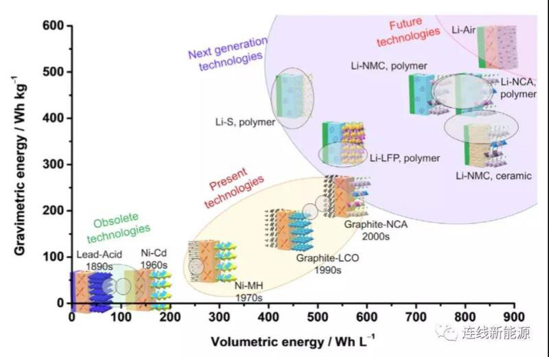 1991年索尼公司首次推出商業(yè)鋰離子電池,此后在廣大科研工作者和工程師的不懈努力下,鋰離子電池的各項性能都得到了大幅的提升【1】,而鋰離子電池的應(yīng)用領(lǐng)域也從最初的3C消費電子領(lǐng)域擴展到了新能源汽車和分布式儲能等領(lǐng)域。鋰離子電池在動力電池領(lǐng)域的應(yīng)用也促使其對能量密度的追求在不斷走高,盡管目前鋰離子電池的能量密度已經(jīng)相當于最初索尼推出產(chǎn)品的3倍以上【2】,但是仍然無法滿足日益增加的續(xù)航里程的需求。如今傳統(tǒng)液態(tài)電解液鋰離子電池的能量密度提升已經(jīng)接近其極限值,難以滿足下一代高比能動力電池的需求,因此主流的動力電池廠商也都在紛紛布局下一代動力電池技術(shù)。