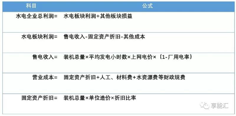 水電板塊利潤=裝機(jī)總量×平均發(fā)電小時數(shù)×上網(wǎng)電價-固定資產(chǎn)折舊-其他成本。