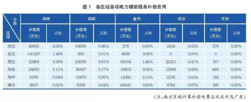 從2018年上半年電力輔助服務(wù)的數(shù)據(jù)看:東北、西北區(qū)域調(diào)峰補(bǔ)償力度最大,西北、華北區(qū)域調(diào)頻(西北區(qū)域調(diào)頻為AGC加一次調(diào)頻,其他區(qū)域調(diào)頻為AGC)補(bǔ)償力度最大,西北、南方區(qū)域備用補(bǔ)償力度最大(如圖1所示)。