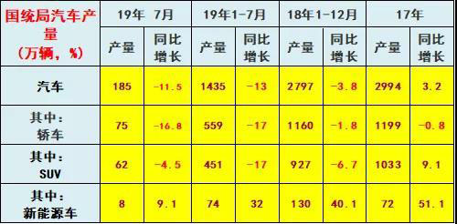 分產(chǎn)品看, 19年7月份汽車生產(chǎn)的日均汽車生產(chǎn)6.0萬臺,增長-12%??紤]到18年7月的6.7萬的較低增速,今年增速-15%的表現(xiàn)相對很差。