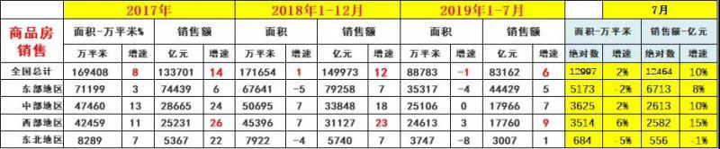 1—7月份,東部地區(qū)商品房銷售面積35317萬平方米,同比下降4.2%,降幅比1—6月份收窄0.4個百分點;銷售額44429億元,增長5.2%,增速加快0.5個百分點。中部地區(qū)商品房銷售面積25106萬平方米,下降0.1%,降幅收窄0.4個百分點;銷售額17966億元,增長6.7%,增速加快0.6個百分點。西部地區(qū)商品房銷售面積24613萬平方米,增長2.8%,增速加快0.5個百分點;銷售額17760億元,增長9.3%,增速加快0.9個百分點。東北地區(qū)商品房銷售面積3747萬平方米,下降7.8%,降幅收窄0.5個百分點;銷售額3007億元,增長0.5%,增速回落0.4個百分點。