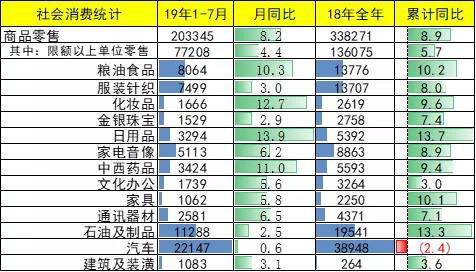 2019年1-7月份,社會消費品零售總額228283億元,同比增長8.3%。其中,除汽車以外的消費品零售額206136億元,增長9.2%。。