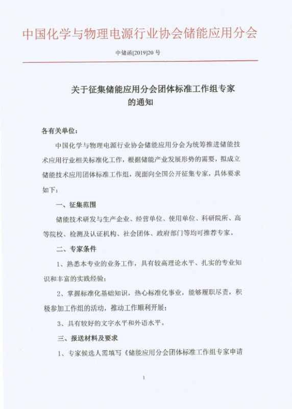 關于征集儲能應用分會團體標準工作組專家的通知