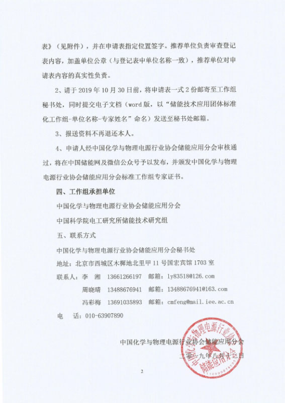 2、請于2019年10月30日前,將申請表一式2份郵寄至工作組秘書處,同時提交電子文檔(word版,以“儲能技術應用團體標準化工作組-單位名稱-專家姓名”命名)發(fā)送至秘書處郵箱。