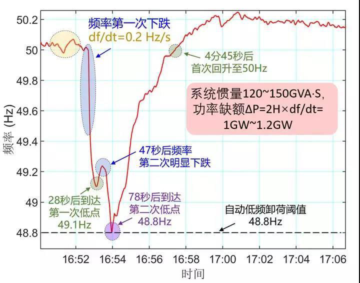 重點一:先前媒體報道的情況是660MW的小巴福電站的跳閘,導(dǎo)致了頻率的急速下跌,而47秒后霍恩熙風電場再次跳閘,導(dǎo)致了頻率的第二次下跌。在660MW發(fā)電饋入損失的情況下,電網(wǎng)的頻率為何會發(fā)生0.2Hz/s的快速跌落?