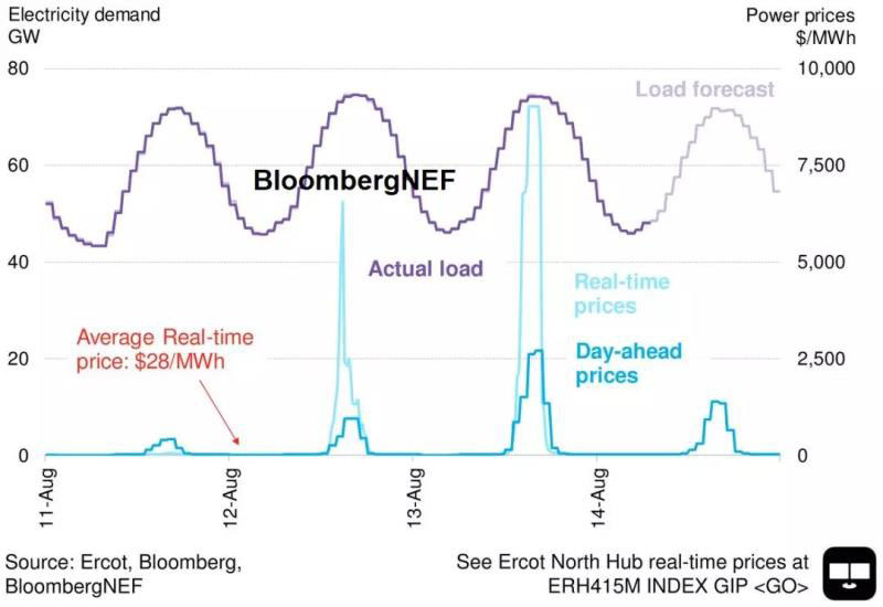 德克薩斯州ERCOT電力市場(chǎng)的現(xiàn)貨價(jià)格在美國(guó)時(shí)間周二下午飆升至$9000/MWh(按當(dāng)天匯率,約合63元/度),歷史上第二次出現(xiàn)了天花板價(jià)。