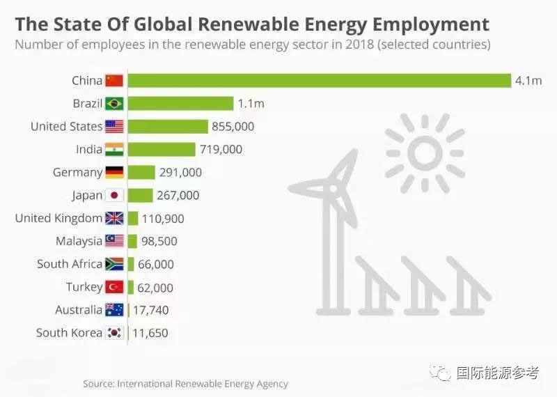 IRENA的報(bào)告指出,中國(guó)無(wú)疑是全球可再生能源就業(yè)市場(chǎng)的領(lǐng)導(dǎo)者,去年從業(yè)人數(shù)達(dá)到410萬(wàn),占全球就業(yè)人數(shù)總量的39%。