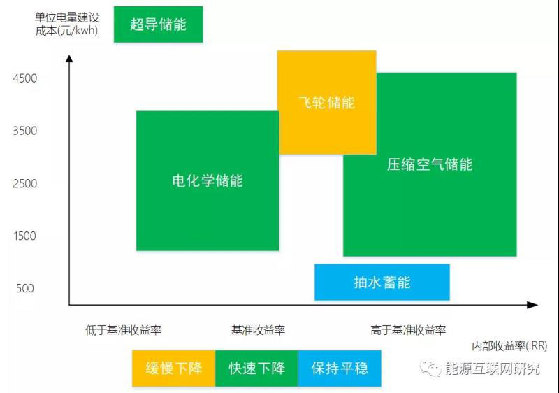 可見(jiàn),從國(guó)民經(jīng)濟(jì)評(píng)價(jià)角度,電網(wǎng)側(cè)儲(chǔ)能具有良好的外部性,針對(duì)具體的電網(wǎng)側(cè)儲(chǔ)能項(xiàng)目,可設(shè)定假定參數(shù),開(kāi)展面向電力系統(tǒng)效益的財(cái)務(wù)分析,為電網(wǎng)側(cè)儲(chǔ)能投資、建設(shè)、可持續(xù)發(fā)展路徑以及市場(chǎng)化機(jī)制和政策的建立提供參考?;陔娏ο到y(tǒng)效益的電網(wǎng)側(cè)儲(chǔ)能成本主要包括建設(shè)成本、安裝成本、運(yùn)行維護(hù)成本、更新改造成本。電網(wǎng)側(cè)儲(chǔ)能在電力系統(tǒng)中的收益主要包括、提升電網(wǎng)利用效率、提高供電可靠性、節(jié)能收益、減排收益、延緩裝機(jī)總量收益、應(yīng)急供電收益、參與電力市場(chǎng)輔助服務(wù)收益等。根據(jù)基于電力系統(tǒng)效益的電網(wǎng)側(cè)儲(chǔ)能成本和收益分析,利用項(xiàng)目財(cái)務(wù)分析方法和模型,對(duì)相同邊界條件下各類(lèi)電網(wǎng)側(cè)儲(chǔ)能經(jīng)濟(jì)性進(jìn)行評(píng)價(jià),定性得到其各類(lèi)項(xiàng)目經(jīng)濟(jì)性結(jié)果和內(nèi)部收益率范圍,如下圖所示。