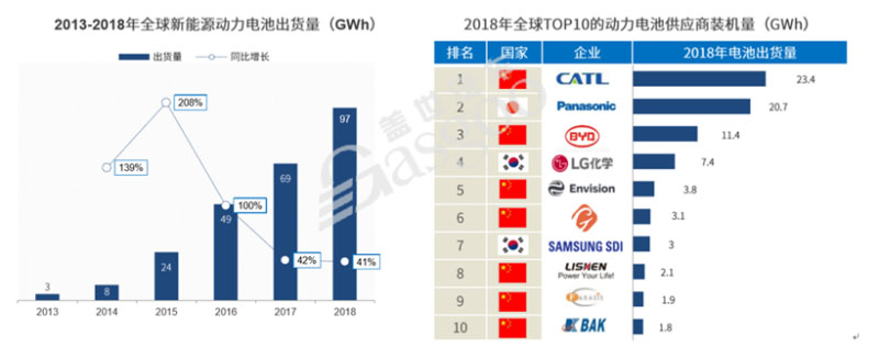 根據(jù)蓋世汽車研究院統(tǒng)計,2018年全球新能源動力電池出貨量達到97GWh,同比增長41%。而裝機量占據(jù)前十名的企業(yè)均被中日韓三國包攬,除來自日本的松下、來自韓國的LG化學、三星SDI以外,其余七家均為中國企業(yè),代表企業(yè)有寧德時代(CATL)、比亞迪和國軒高科。