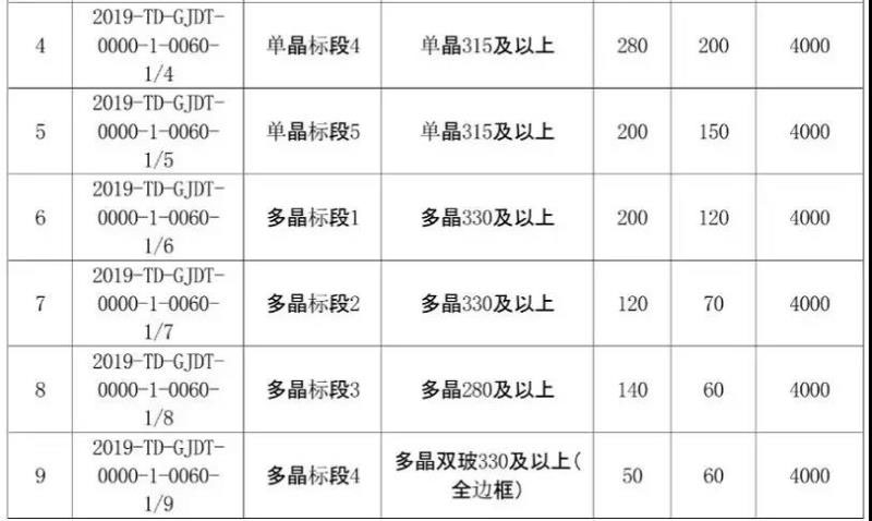 根據(jù)招標公告,本次投標人如對多晶標段1、2、3進行投標,必須對這3個標段全部進行投標,多晶標段1、2所投組件應為統(tǒng)一規(guī)格(功率);如對單晶標段3、4、5進行投標,必須對這3個標段全部進行投標,所投組件應為統(tǒng)一規(guī)格(功率)。各標段招標規(guī)格及容量如下表: