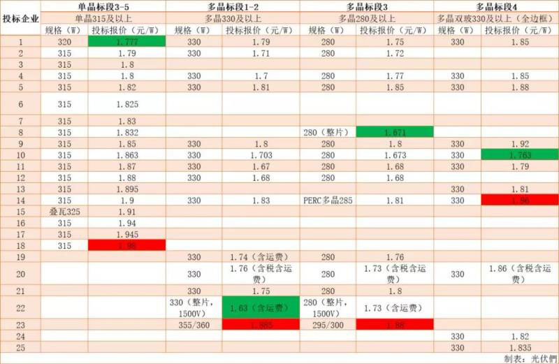 從開標價格來看,此次投標價格遠低于目前市場價(1.92-2.0元/瓦),最低報價1.777元/瓦,最高報價1.98元/瓦,平均報價1.862元/瓦。