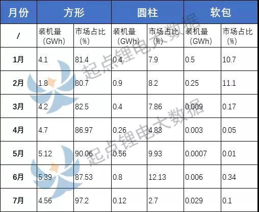 但是在車規(guī)級(jí)動(dòng)力電池方面,從2019年各月份的數(shù)據(jù)看,事實(shí)并不是三足鼎立,而是方形電池“一家獨(dú)大”。