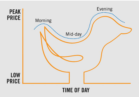 對(duì)于能源市場(chǎng)的業(yè)界人士來說,“鴨子曲線”指的是一天中電力需求的圖表,電力需求在每天的早上先達(dá)到一個(gè)峰值(尾巴),在中午位于低谷(背部),而電力需求在傍晚上升并再次出現(xiàn)一個(gè)峰值(頭部)。這條曲線的輪廓就像一只鴨子,如圖1所示。