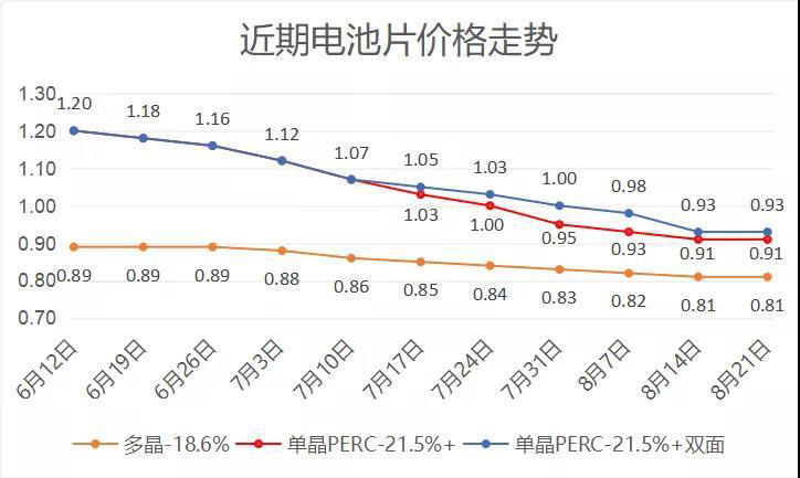 到了二季度末,在國內(nèi)的630小幅搶裝結(jié)束,下半年競價項目還未啟動的現(xiàn)狀下,加上適逢歐洲市場夏季假期,需求的階段性下滑加上單晶PERC電池產(chǎn)能的陸續(xù)釋放,開啟了這一輪PERC電池片的跌價。