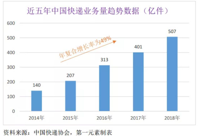 2014~2018年,國(guó)內(nèi)快遞業(yè)務(wù)量年均復(fù)合增長(zhǎng)率達(dá)到49%。