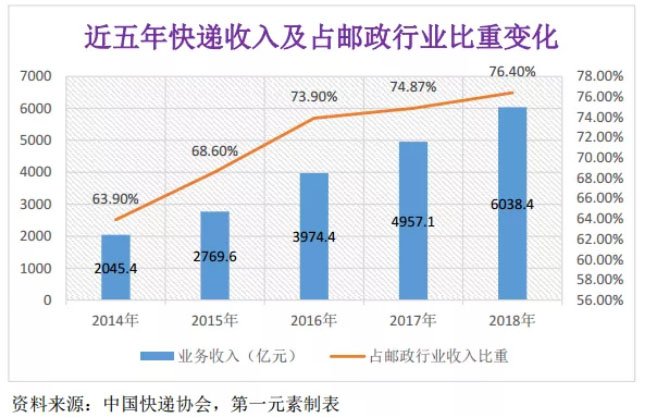 2018年,全國(guó)快遞業(yè)務(wù)收入占郵政行業(yè)業(yè)務(wù)收入比重為76.4%,同比提高1.5個(gè)百分點(diǎn)。