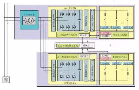 在儲能系統(tǒng)中,儲能電池在高壓上只與儲能變流器發(fā)生交互,變流器從交流電網(wǎng)取電,給電池組充電;或者電池組給變流器供電,電能通過變流器轉(zhuǎn)換成交流發(fā)送到交流電網(wǎng)上去。