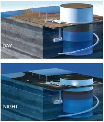 其原理如圖所示:用圓柱體的巖石(像一個活塞一樣)嵌放在形狀相同的儲水池中,有富余電力時(例白天有光伏發(fā)電時),泵會把水壓入儲水池中,此時巖石活塞就會被水壓提起,即電能轉(zhuǎn)化成了重力勢能。而當(dāng)電網(wǎng)需要電能供應(yīng)時(例晚上無光伏發(fā)電時),閘門會打開,此時巖石活塞會下降,擠壓儲水池中的水流經(jīng)泵來發(fā)電,此時重力勢能會轉(zhuǎn)化成電能。