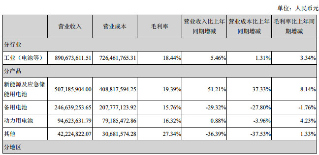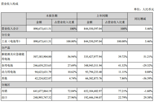 報(bào)告表示本期新能源及應(yīng)急儲能用電池營業(yè)收入同比增加51.21%,主要是由于海外應(yīng)急儲能業(yè)務(wù)銷售量增加所致。