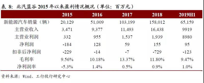 我們以國(guó)內(nèi)新能源汽車標(biāo)竿企業(yè)之一的北汽藍(lán)谷為例,該公司常年銷量?jī)H次于比亞迪位居國(guó)內(nèi)第二,也是國(guó)內(nèi)唯一一家以新能源汽車整車為核心業(yè)務(wù)的上市公司。盡管近年來(lái)公司新能源汽車銷量一路高歌猛進(jìn),但公司盈利能力卻并未得到相應(yīng)提升,2018年北汽藍(lán)谷雖然實(shí)現(xiàn)了高達(dá)15.8萬(wàn)輛的銷量,但其凈利潤(rùn)僅有1.55億元,扣除非經(jīng)常性損益后甚至還虧損7.29億元,公司毛利率近年來(lái)基本維持在10%左右的低水平,凈利潤(rùn)率多數(shù)年份不足1%,而且在2015年以來(lái)的五個(gè)年度年中,北汽藍(lán)谷沒(méi)有一年的核心凈利潤(rùn)為正值。