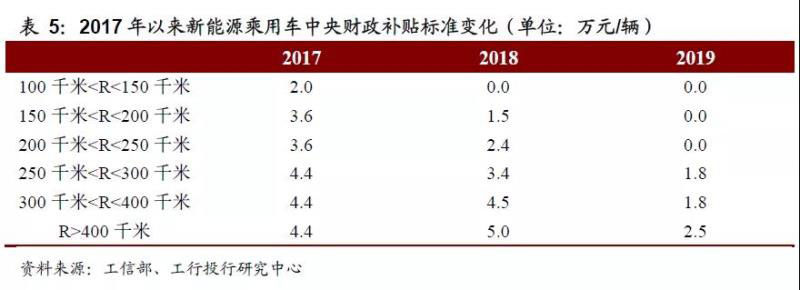 2019年國(guó)內(nèi)新能源汽車補(bǔ)貼出現(xiàn)大幅退坡,盡管補(bǔ)貼下調(diào)在市場(chǎng)預(yù)期之中,但我們認(rèn)為這仍將對(duì)2019下半年國(guó)內(nèi)新能源汽車市場(chǎng)有不小的沖擊。2019年補(bǔ)貼新政發(fā)布較晚,遲至3月底才發(fā)布,設(shè)置了為期3個(gè)月的過(guò)渡期,正式實(shí)施是在2019年7月份開(kāi)始。與往年相比,2019年的新能源補(bǔ)貼政策有三個(gè)方面的顯著變化:一是補(bǔ)貼額大幅下調(diào),無(wú)論是乘用車還是商用車,補(bǔ)貼下調(diào)力度都較大。新能源乘用車直接取消了續(xù)航里程250千米以下車型的補(bǔ)貼,250千米以上續(xù)航里程車型補(bǔ)貼額減少50%以上,同時(shí)將2018年的五級(jí)分檔改為三級(jí)。新能源客車方面,補(bǔ)貼下降幅度也在50%以上,快充類大型純電動(dòng)客車2018年最高可獲補(bǔ)貼額13萬(wàn)元,但2019年新政后則下降至6.5萬(wàn)元。二是政策明確了過(guò)渡期后新能源乘用車將不再享受地方政府補(bǔ)貼,考慮到目前地方補(bǔ)貼大致為國(guó)補(bǔ)的50%左右,因此對(duì)于新能源乘用車而言退坡幅度和力度更大。三是獲得補(bǔ)貼的門檻繼續(xù)提高,2018年純電動(dòng)汽車搭載動(dòng)力鋰電池密度需要達(dá)到105瓦時(shí)/千克即可獲得補(bǔ)貼,但2019年該標(biāo)準(zhǔn)提高到125千瓦時(shí)/千克,這促使乘用車企業(yè)搭載能量密度更高的動(dòng)力鋰電池。