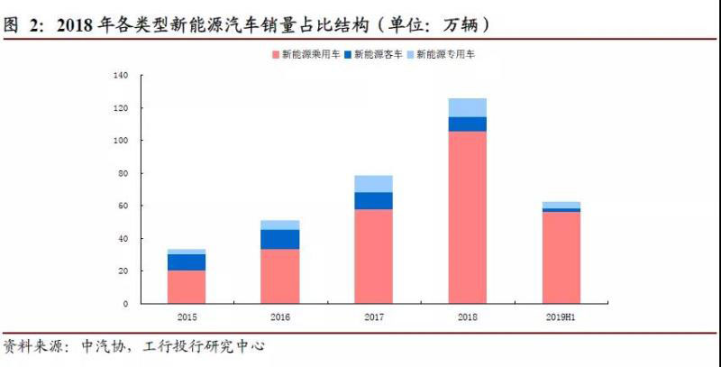 從新能源汽車的產(chǎn)業(yè)結(jié)構(gòu)看,乘用車已成為絕對(duì)主力。根據(jù)2019上半年的數(shù)據(jù)顯示,新能源乘用車銷量為56.3萬(wàn)輛,占到新能源汽車總銷量的91.2%,而新能源客車、新能源專用車(物流、環(huán)衛(wèi)、載貨)銷量分別僅有2.1萬(wàn)輛和3.3萬(wàn)輛,占比分別僅有3.4%和5.3%,可以看出新能源乘用車已經(jīng)成為新能源汽車的主導(dǎo)力量。而在2017年和2018年國(guó)內(nèi)新能源乘用車的占比還分別僅為74.5%和83.8%,導(dǎo)致新能源乘用車占比持續(xù)上升的主要原因在于新能源客車和專用車市場(chǎng)空間有限而且完全依賴政策驅(qū)動(dòng),如目前的新能源客車市場(chǎng)需求主要來(lái)自于公交替換,每年需求量基本穩(wěn)定在10萬(wàn)輛左右,需求已遭遇天花板,專用車由于成本原因推廣阻力也較大,而乘用車市場(chǎng)一方面需求總量較大,二是政策驅(qū)動(dòng)效果明顯,因此成為引領(lǐng)新能源汽車增長(zhǎng)的關(guān)鍵。從未來(lái)發(fā)展前景來(lái)看,新能源乘用車也是最具增長(zhǎng)潛力的市場(chǎng),到2020年我國(guó)政府的目標(biāo)是希望新能源汽車銷量可以達(dá)到200萬(wàn)輛,新增的需求量將幾乎全部來(lái)自于乘用車市場(chǎng)。