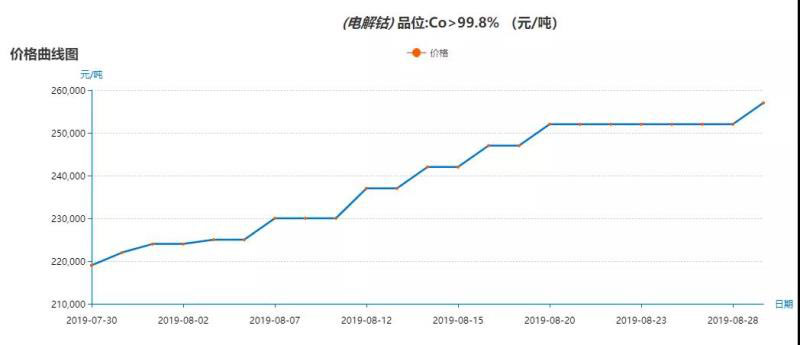 本月初,嘉能可宣布將于2021年以前暫停旗下位于剛果(金)的Mutanda礦生產(chǎn)。據(jù)了解,2018年Mutanda礦產(chǎn)鈷2.73萬噸,占全球供應(yīng)鏈的20.8%,是當(dāng)前全球最大的鈷礦。Mutanda停產(chǎn)的消息極大地刺激了全球“鈷”市,萎靡多時的鈷價立即大幅反彈。截至8月29日,電解鈷的價格已經(jīng)達(dá)到257000元/噸,較8月6日Mutanda透露停產(chǎn)消息之前的價格225000元/噸,有了大幅上漲。同時,也間接帶動了如贛鋒鋰業(yè)、盛屯礦業(yè)等在鈷礦上有所布局的動力電池產(chǎn)業(yè)鏈企業(yè)股市上揚(yáng)。
