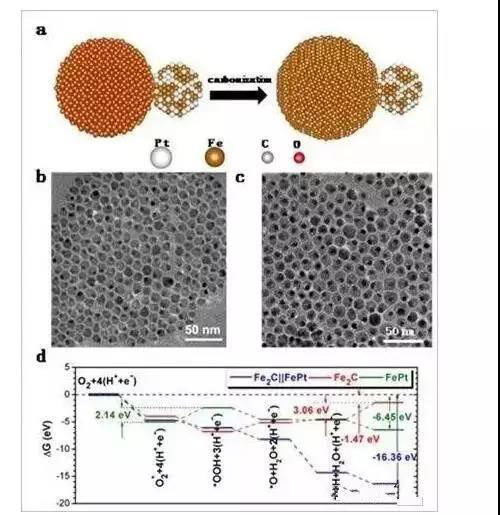 今年6月,北京大學工學院郭少軍團隊設(shè)計開發(fā)了一種新型啞鈴狀的PtFe-Fe2C納米粒子。這種啞鈴狀的PtFe-Fe2C納米粒子是通過碳化啞鈴狀的PtFe-Fe3O4納米粒子獲得(圖1a)。電化學測試表明,該催化劑在酸性介質(zhì)中的氧還原的比活性和質(zhì)量活性分別達到了3.53mAcm2和1.50Amg1,比商業(yè)Pt/C分別高出11.8和7.1倍,且具有極為優(yōu)異的電化學穩(wěn)定性,經(jīng)歷5000個循環(huán)催化劑的活性幾乎沒有衰減。