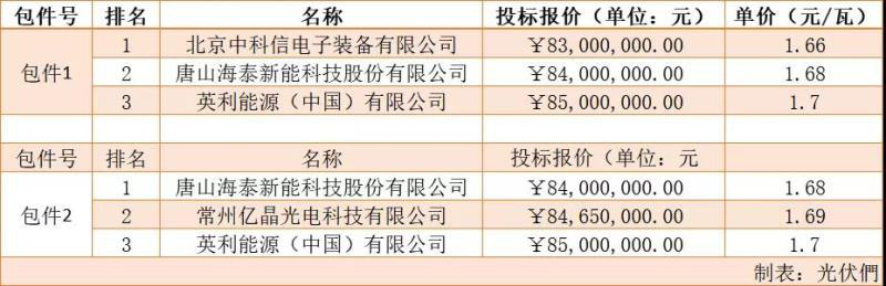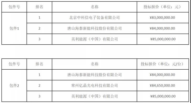 其中,北京中科信電子裝備、唐山海泰分別位列組件兩個(gè)標(biāo)段第一中標(biāo)候選人。從招標(biāo)要求看,組件要求為多晶275/280/330Wp,即為常規(guī)多晶組件;從報(bào)價(jià)上看,最低價(jià)格為1.66元/瓦。在集中式逆變升壓一體機(jī)招標(biāo)中,深圳科士達(dá)為該標(biāo)段第一中標(biāo)候選人,最低價(jià)格為0.186元/瓦。