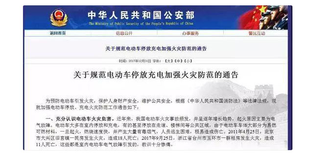 2017年12月31日,公安部緊急下發(fā)《關(guān)于規(guī)范電動(dòng)車停放充電加強(qiáng)火災(zāi)防范的通告》,要求規(guī)范電動(dòng)車停放充電行為,嚴(yán)厲查處違規(guī)停放充電行為。
