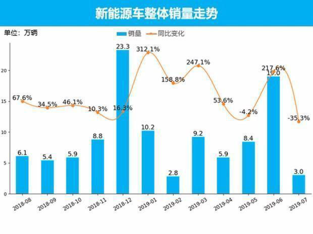 從整體新能源市場(chǎng)銷(xiāo)量情況來(lái)看,2019年7月,新能源車(chē)共銷(xiāo)售了3.0萬(wàn)輛,占整個(gè)市場(chǎng)銷(xiāo)量的2.1%。與上個(gè)月相比,銷(xiāo)量環(huán)比下降84%。與去年同期相比,銷(xiāo)量同比下跌35.3%,為近一年內(nèi)歷史最低。