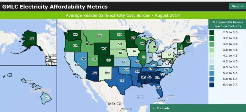 電費占居民收入最高的是阿拉巴馬州(7.4%)、密西西比州(7.1%)、亞利桑那州(6.8%)。