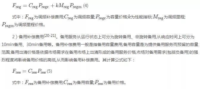 1)調(diào)頻補(bǔ)償費用[19]。調(diào)頻有償服務(wù)一般指的是二次調(diào)頻,所獲得的激勵補(bǔ)償與其調(diào)頻的容量、總步長、精度、響應(yīng)時間及速率等響應(yīng)情況有關(guān),反映了其在平衡市場上的實際貢獻(xiàn)。對于開展調(diào)頻市場的地區(qū),調(diào)頻可采用兩部制補(bǔ)償,包括調(diào)頻容量補(bǔ)償、調(diào)頻里程補(bǔ)償。對于尚未開展調(diào)頻市場的地區(qū),一般采用調(diào)頻容量補(bǔ)償。調(diào)頻容量是為提供調(diào)頻服務(wù)而預(yù)留的容量范圍,調(diào)頻里程是實際發(fā)生上下調(diào)的總步長,補(bǔ)償費用可結(jié)合性能指標(biāo)進(jìn)行計算。性能指標(biāo)反映調(diào)頻的精度、響應(yīng)時間及速率,表示其跟蹤AGC信號的緊密程度,調(diào)頻性能指標(biāo)越高,獲得收益越大,其響應(yīng)效果影響最終所能獲得的總收益。兩部制調(diào)頻補(bǔ)償費用計算公式如下: